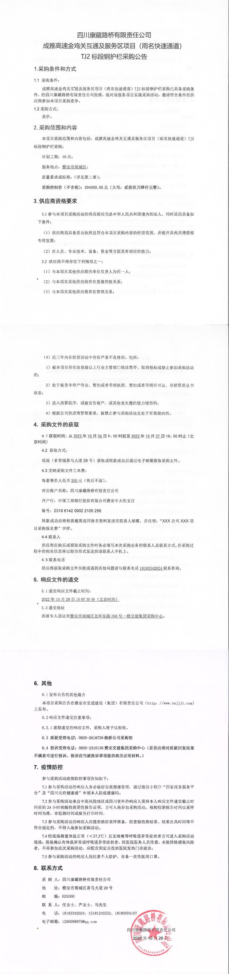 四川康藏路橋有限責任公司成雅高速金雞關互通及服務區(qū)項目(雨名快速通道)TJ2標段鋼護欄采購公告
