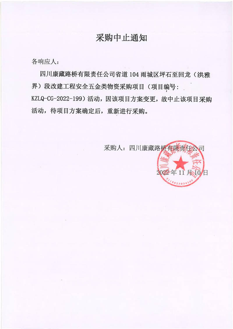 四川康藏路橋有限責任公司省道104雨城區(qū)坪石至回龍(洪雅界)段改建工程安全五金類物資采購項目采購中止通知