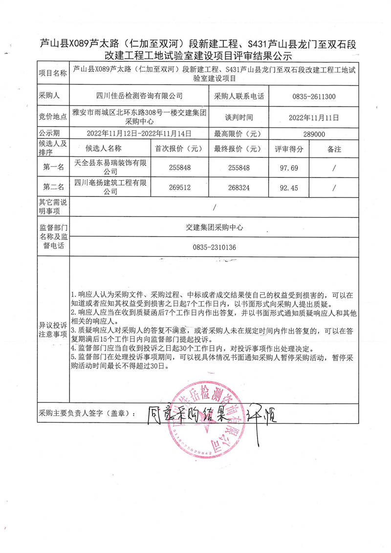 四川佳岳檢測(cè)咨詢有限公司蘆山縣X089蘆太路(仁加至雙河)段新建工程、S431蘆山縣龍門(mén)至雙石段改建工程工地試驗(yàn)室建設(shè)項(xiàng)目評(píng)審結(jié)果公示
