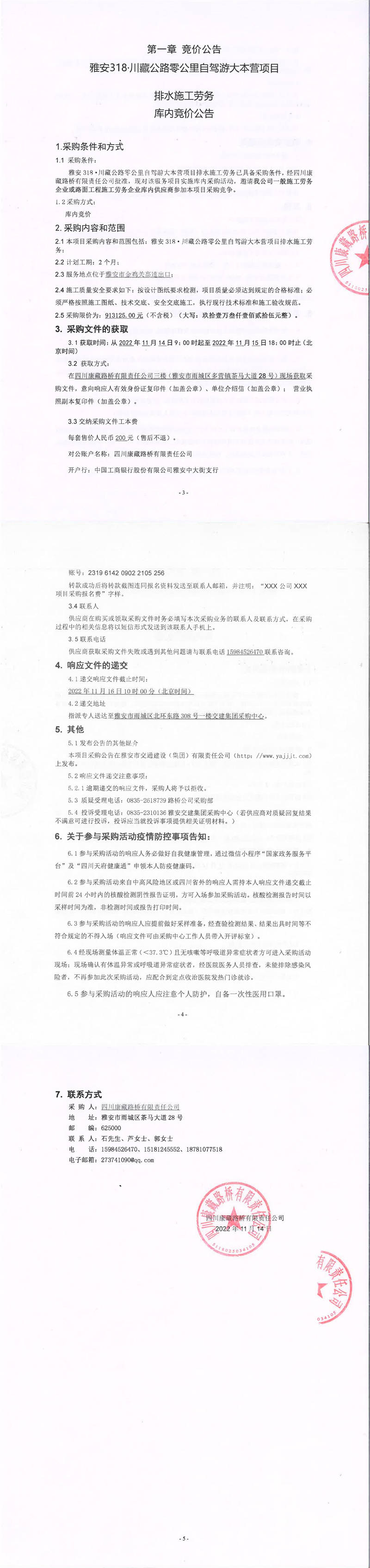 四川康藏路橋有限責(zé)任公司雅安318.川藏公路零公里自駕游大本營項(xiàng)目排水施工勞務(wù)庫內(nèi)競價(jià)公告