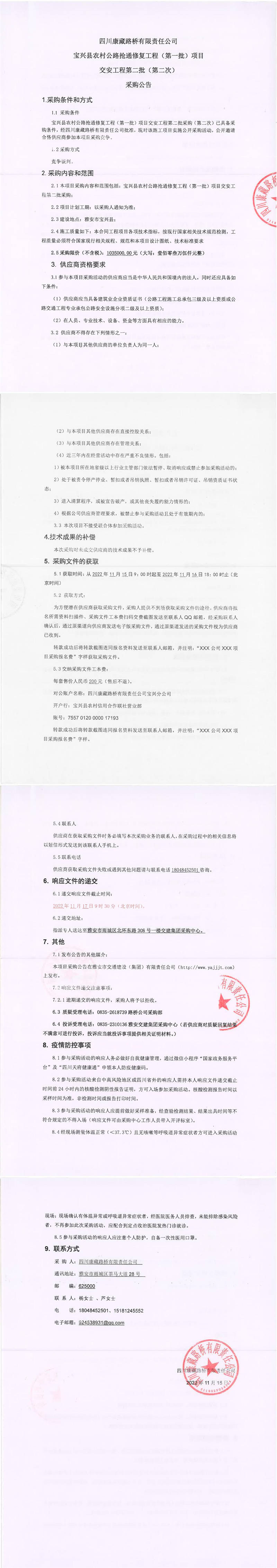 四川康藏路橋有限責任公司寶興縣農(nóng)村公路搶通修復工程(第一批)項目交安工程第二批采購(第二次)結(jié)果公示