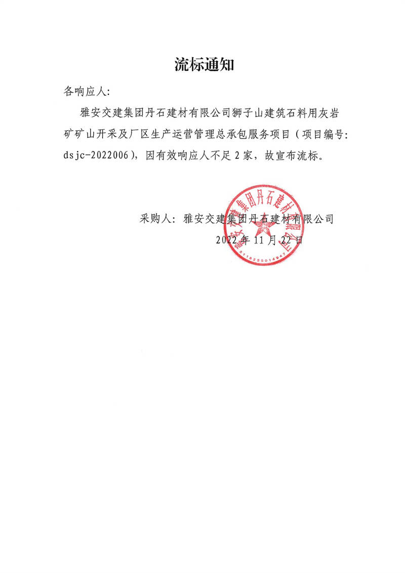 雅安交建集團(tuán)丹石建材有限公司獅子山建筑石料用灰?guī)r礦礦山開(kāi)采及廠(chǎng)區(qū)生產(chǎn)運(yùn)營(yíng)管理總承包服務(wù)項(xiàng)目采購(gòu)流標(biāo)通知