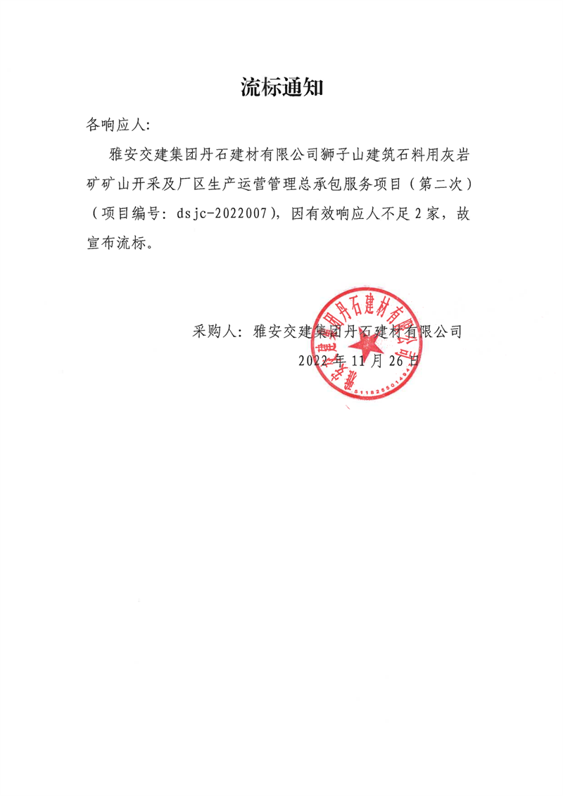 雅安交建集團(tuán)丹石建材有限公司獅子山建筑石料用灰?guī)r礦礦山開采及廠區(qū)生產(chǎn)運(yùn)營管理總承包服務(wù)項目(第二次)流標(biāo)通知