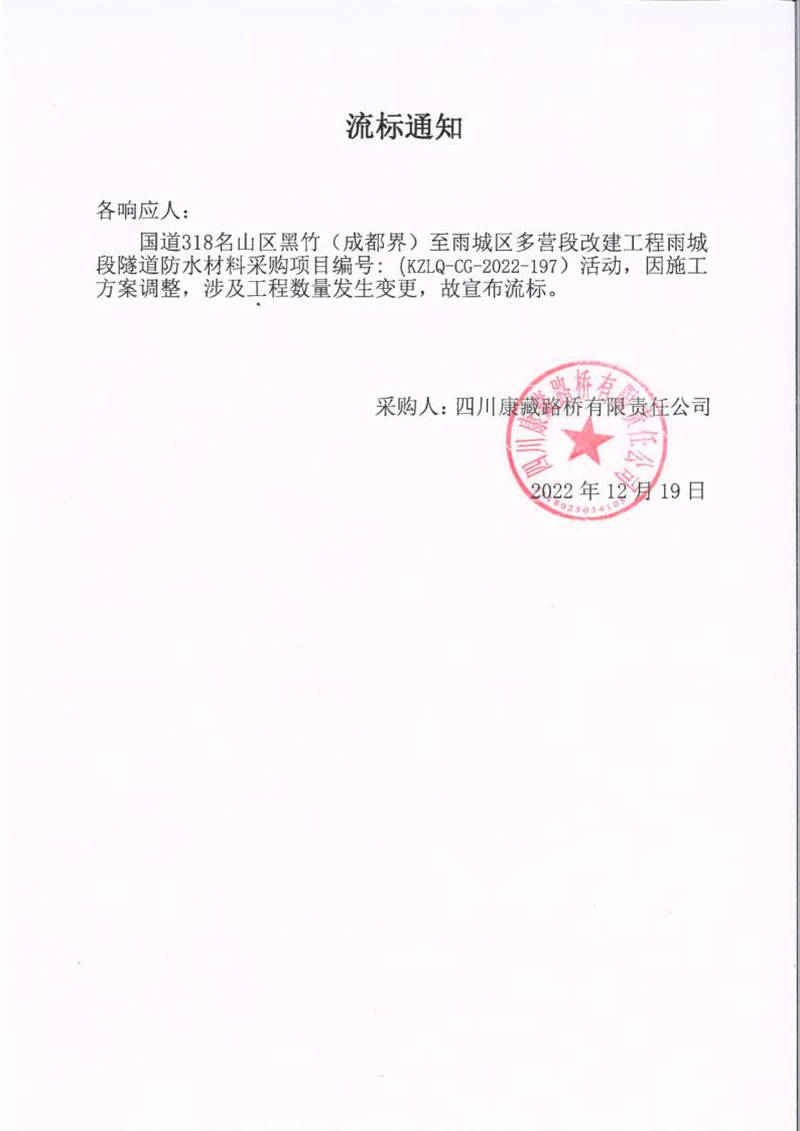 四川康藏路橋有限責(zé)任公司國道318名山區(qū)黑竹(成都界)至雨城區(qū)多營段改建工程雨城段隧道防水材料采購流標通知