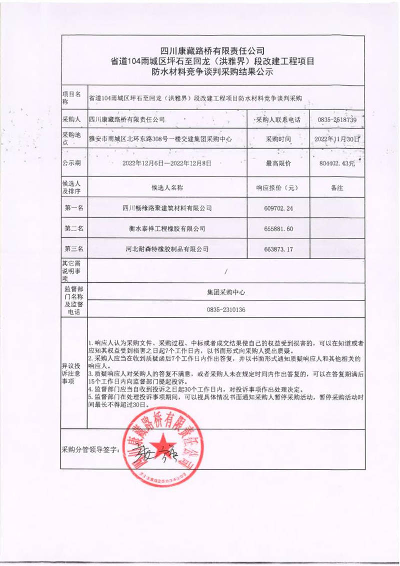 四川康藏路橋有限責(zé)任公司省道104雨城區(qū)坪石至回龍(洪雅界)段改建工程項(xiàng)目防水材料競爭談判采購結(jié)果公示