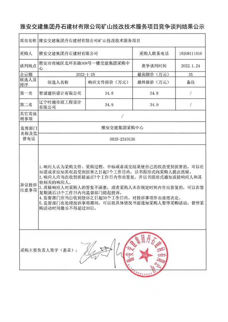 雅安交建集團(tuán)丹石建材有限公司礦山技改技術(shù)服務(wù)項(xiàng)目競(jìng)爭(zhēng)談判結(jié)果公示