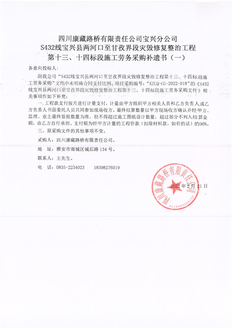 四川康藏路橋有限責任公司寶興分公司S432線寶興縣兩河口至甘孜界段災毀修復整治工程第十三、十四標段施工勞務采購補遺書(一)