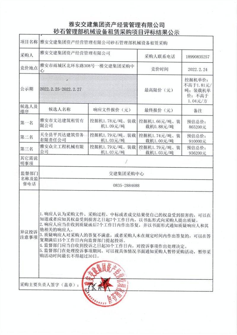 雅安交建集團(tuán)資產(chǎn)經(jīng)營(yíng)管理有限公司砂石管理部機(jī)械設(shè)備租賃采購(gòu)項(xiàng)目評(píng)標(biāo)結(jié)果公示