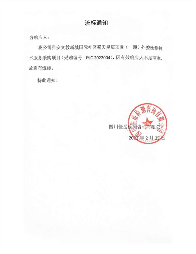 四川佳岳檢測(cè)咨詢(xún)有限公司雅安文教新城國(guó)際社區(qū)蜀天星辰項(xiàng)目(一期)外委檢測(cè)服務(wù)采購(gòu)項(xiàng)目流標(biāo)通知