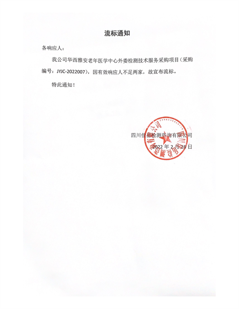 四川佳岳檢測咨詢有限公司華西雅安老年醫(yī)學(xué)中心外委檢測技術(shù)服務(wù)采購項目流標(biāo)通知