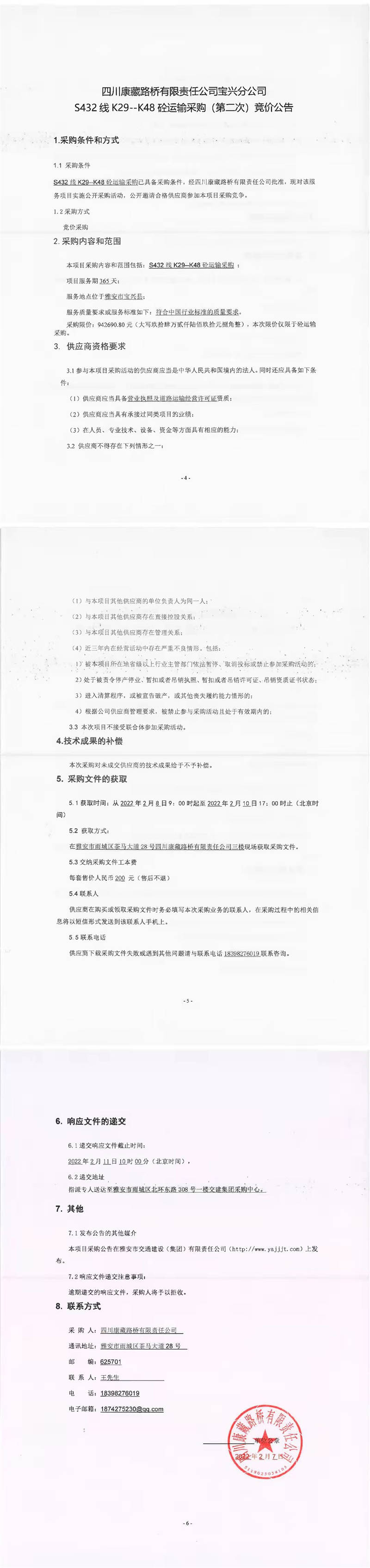 四川康藏路橋有限責(zé)任公司寶興分公司S432線K29-K48砼運(yùn)輸采購(第二次)競價公告