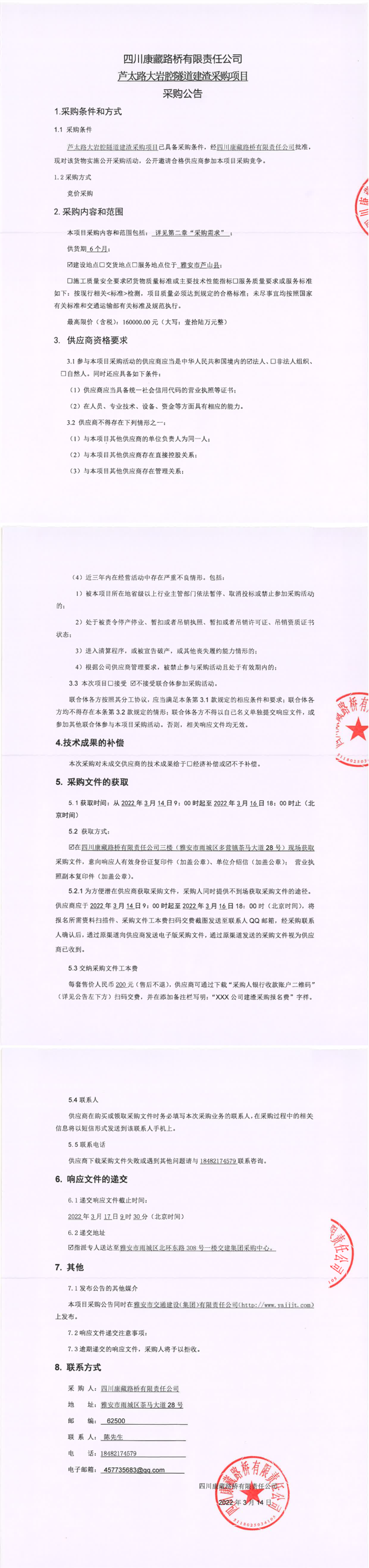 四川康藏路橋有限責(zé)任公司蘆太路大巖腔隧道建渣采購(gòu)項(xiàng)目采購(gòu)公告
