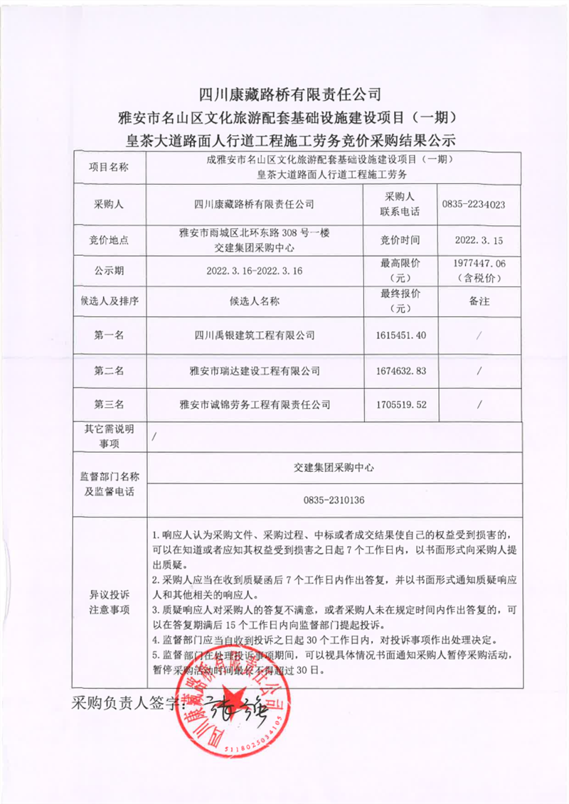 四川康藏路橋有限責(zé)任公司雅安市名山區(qū)文化旅游配套基礎(chǔ)設(shè)施建設(shè)項(xiàng)目(一期)皇茶大道路面人行道工程施工勞務(wù)競(jìng)價(jià)采購(gòu)結(jié)果公示