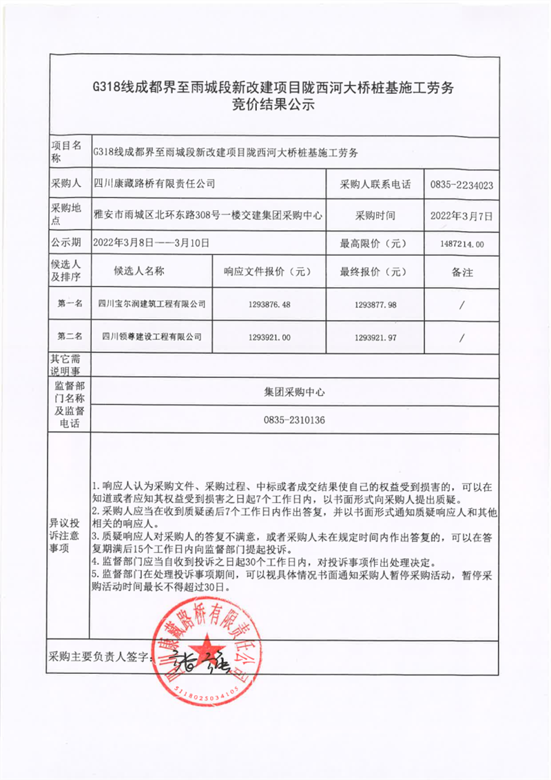 四川康藏路橋有限責(zé)任公司G318線成都界至雨城段新改建項(xiàng)目隴西河大橋樁基施工勞務(wù)競(jìng)價(jià)結(jié)果公示