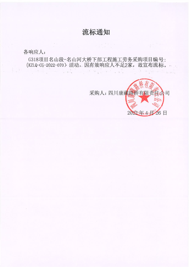 四川康藏路橋有限責任公司G318項目名山段-名山河大橋下部工程施工勞務采購項目流標通知