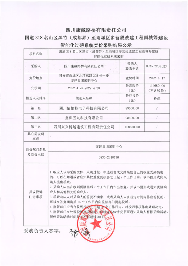 四川康藏路橋有限責(zé)任公司國道318名山區(qū)黑竹(成都界)至雨城區(qū)多營段改建工程雨城籌建段智能化過磅系統(tǒng)競價采購結(jié)果公示
