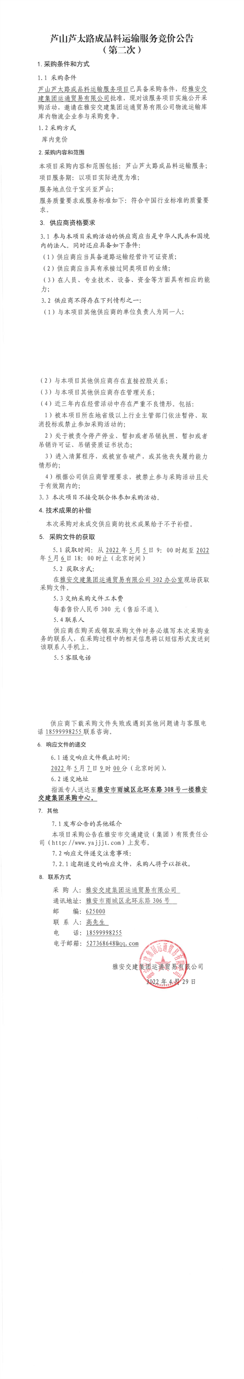 雅安交建集團運通貿易有限公司蘆山蘆太路成品料運輸服務競價公告(第二次)