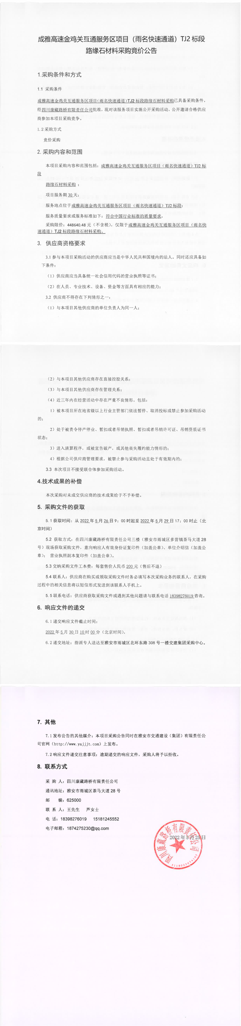 四川康藏路橋有限責(zé)任公司成雅高速金雞關(guān)互通服務(wù)區(qū)項(xiàng)目(雨名快速通道)TJ2標(biāo)段路緣石材料采購競價(jià)公告