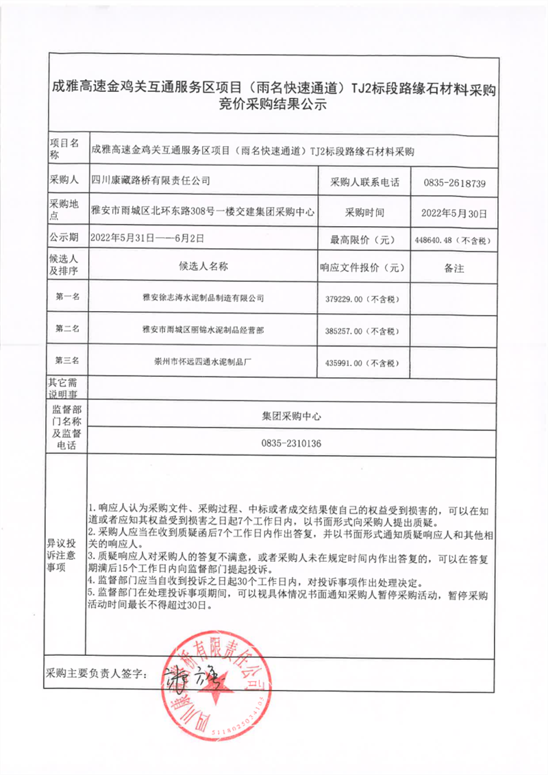四川康藏路橋有限責任公司成雅高速金雞關(guān)互通服務區(qū)項目(雨名快速通道)TJ2標段路緣石材料采購競價采購結(jié)果公示