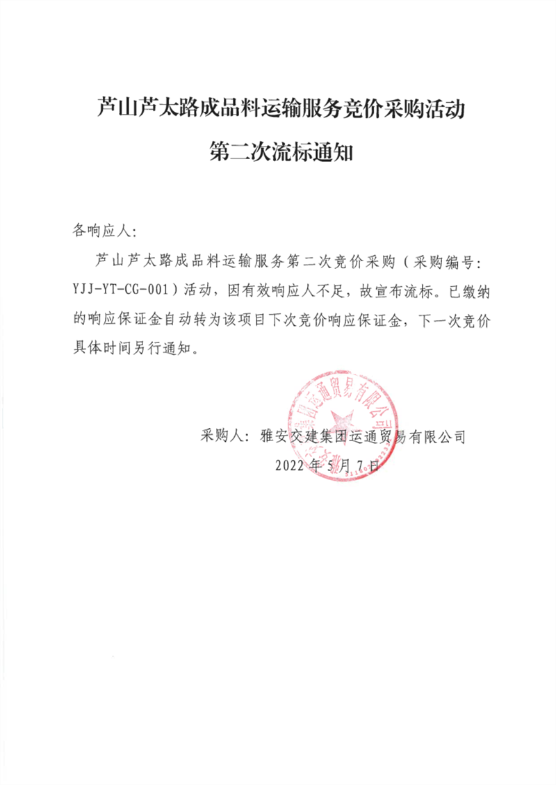 雅安交建集團(tuán)運(yùn)通貿(mào)易有限公司蘆山蘆太路成品料運(yùn)輸服務(wù)競價(jià)采購活動第二次流標(biāo)通知