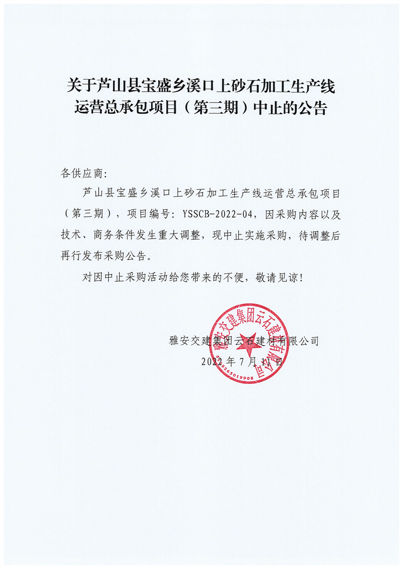 雅安交建集團(tuán)云石建材有限公司關(guān)于蘆山縣寶盛鄉(xiāng)溪口上砂石加工生產(chǎn)線運(yùn)營總承包項目(第三期)中止的公告