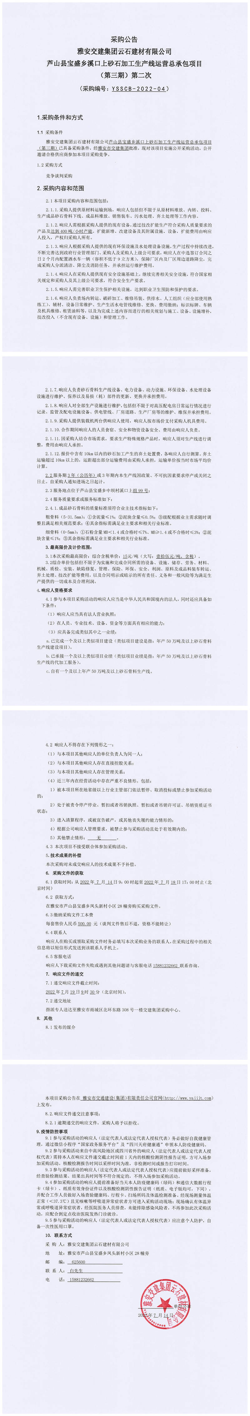 雅安交建集團云石建材有限公司蘆山縣寶盛鄉(xiāng)溪口上砂石加工生產(chǎn)線運營總承包項目(第三期)第二次采購公告