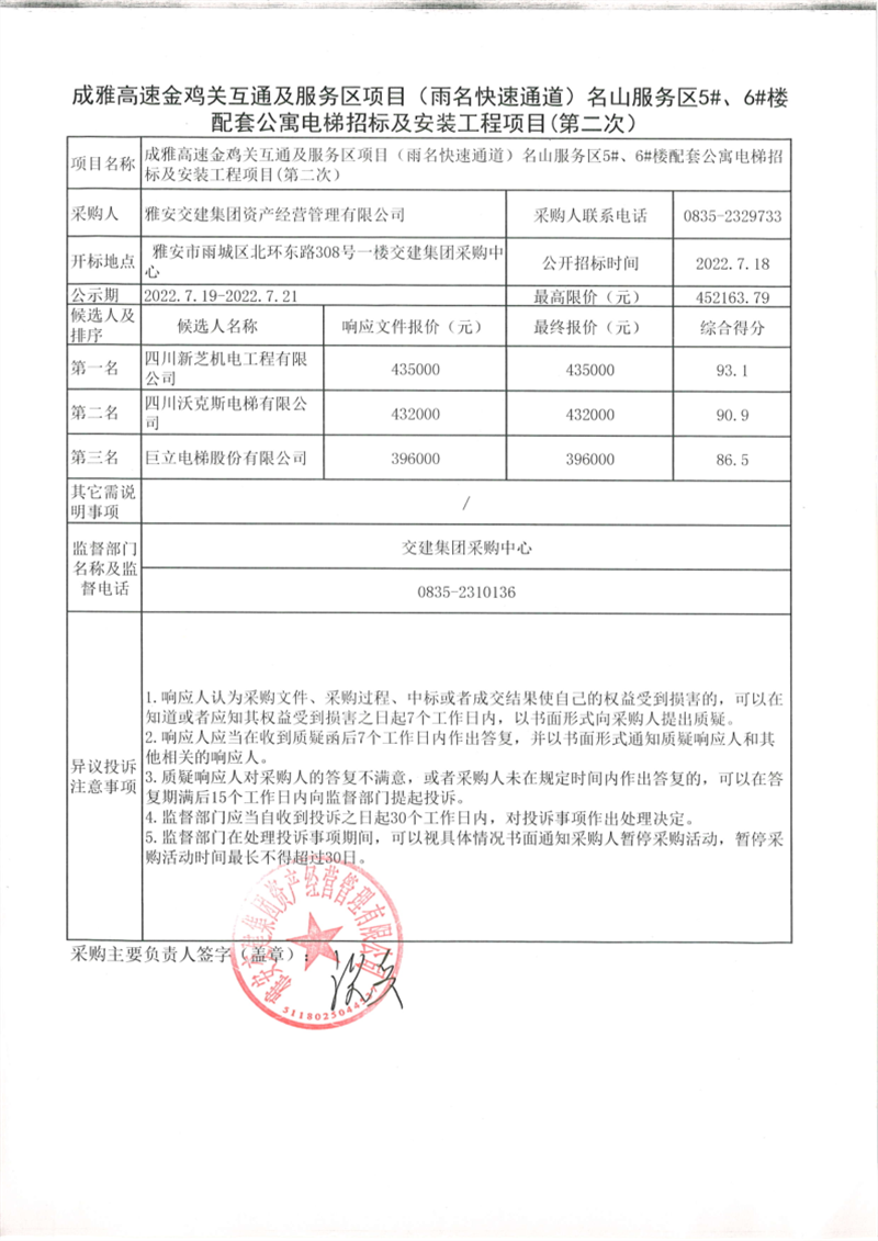 雅安交建集團(tuán)資產(chǎn)經(jīng)營管理有限公司成雅高速金雞關(guān)互通及服務(wù)區(qū)項(xiàng)目(雨名快速通道)名山服務(wù)區(qū)5#、6#樓配套公寓電梯招標(biāo)及安裝工程項(xiàng)目招標(biāo)公告(第二次)結(jié)果公示