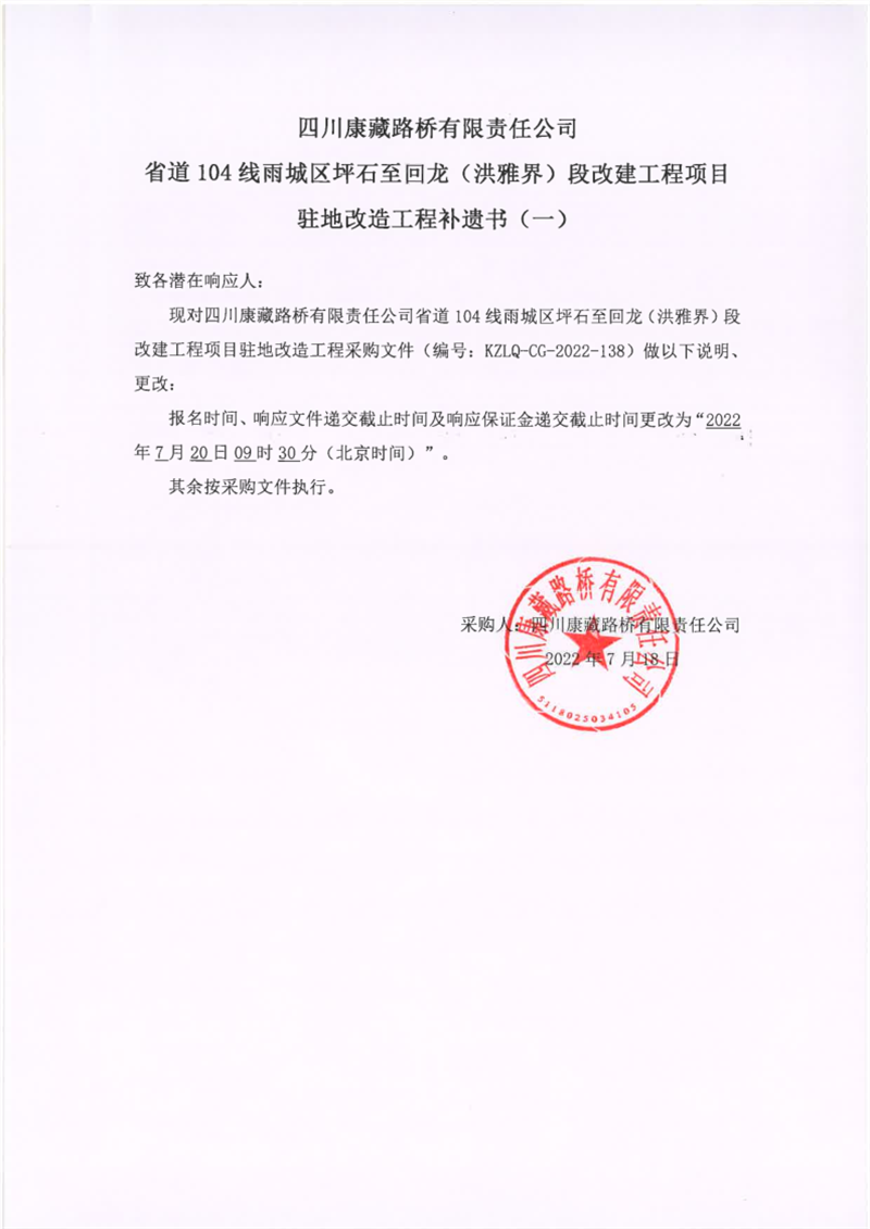 四川康藏路橋有限責(zé)任公司省道104線雨城區(qū)坪石至回龍(洪雅界)段改建工程項目駐地改造工程補(bǔ)遺書(一)