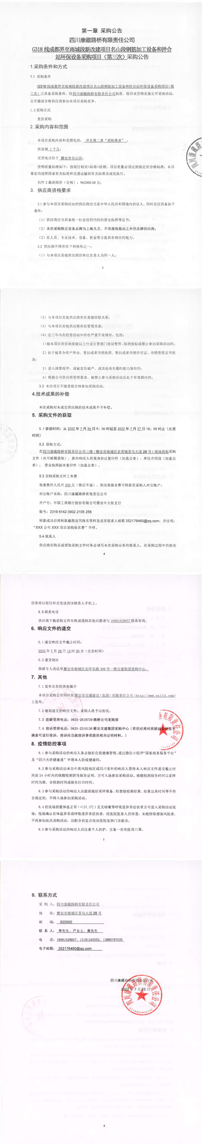 四川康藏路橋有限責(zé)任公司G318線成都界至雨城段新改建項(xiàng)目名山段鋼筋加工設(shè)備和拌合站環(huán)保設(shè)備采購項(xiàng)目(第三次)采購公告