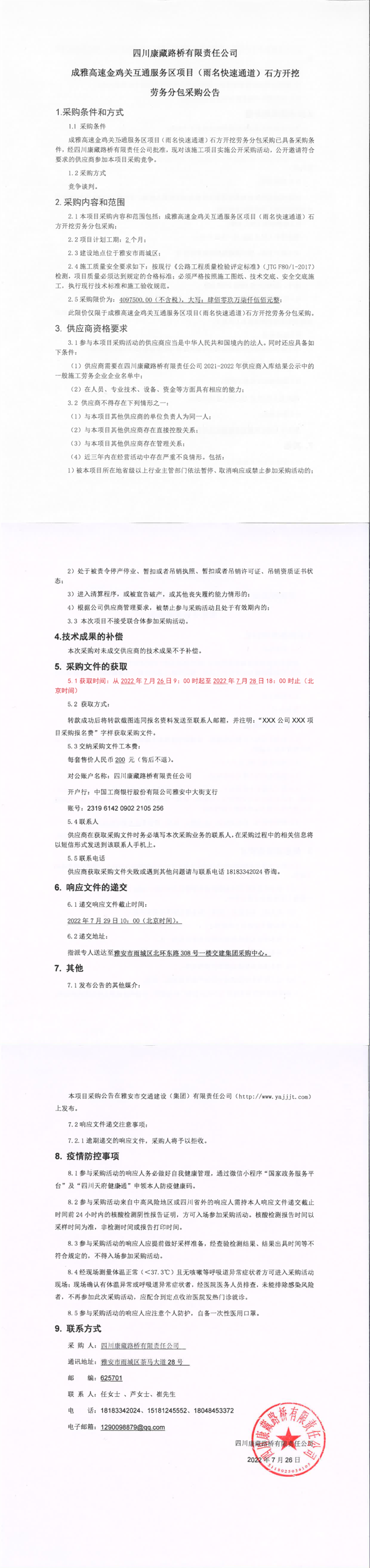 四川康藏路橋有限責(zé)任公司成雅高速金雞關(guān)互通及服務(wù)區(qū)項(xiàng)目(雨名快速通道)石方開(kāi)挖勞務(wù)分包采購(gòu)公告