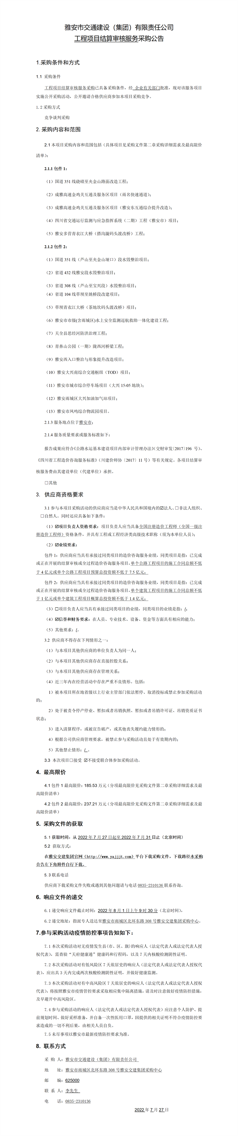 雅安市交通建設(shè)(集團(tuán))有限責(zé)任公司工程項(xiàng)目結(jié)算審核服務(wù)采購公告