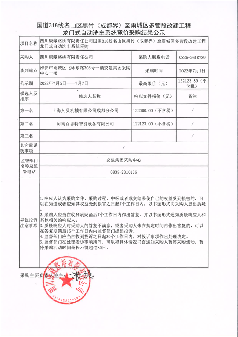 四川康藏路橋有限責(zé)任公司國道318名山區(qū)黑竹(成都界)至雨城區(qū)多營段改建工程龍門式自動洗車系統(tǒng)競價(jià)采購結(jié)果公示