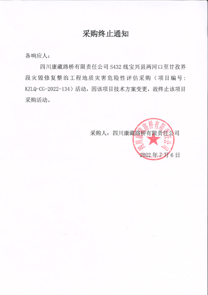 四川康藏路橋有限責(zé)任公司S432線(xiàn)寶興縣兩河口至甘孜界段災(zāi)毀修復(fù)整治工程地質(zhì)災(zāi)害危險(xiǎn)性評(píng)估采購(gòu)終止通知