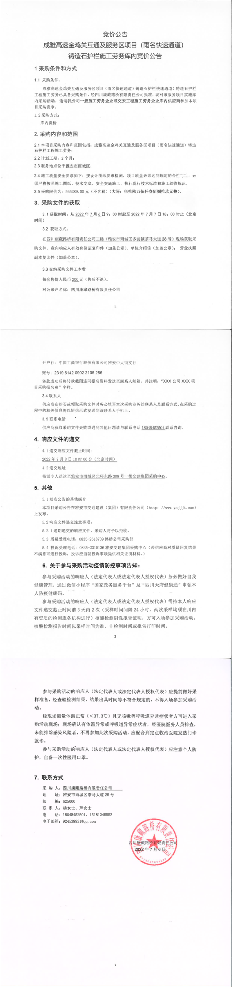 四川康藏路橋有限責(zé)任公司成雅高速金雞關(guān)互通及服務(wù)區(qū)項(xiàng)目(雨名快速通道)鑄造石護(hù)欄施工勞務(wù)庫內(nèi)競價(jià)公告