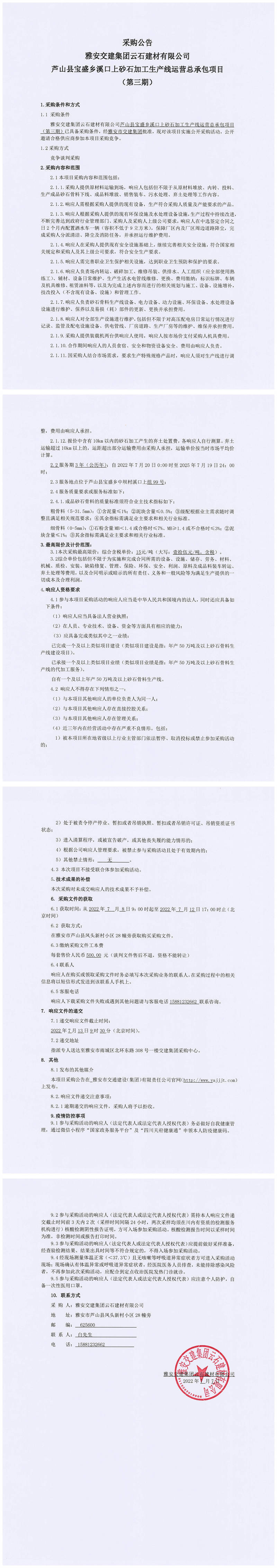 雅安交建集團(tuán)云石建材有限公司蘆山縣寶盛鄉(xiāng)溪口上砂石加工生產(chǎn)線運(yùn)營總承包項(xiàng)目(第三期)采購公告