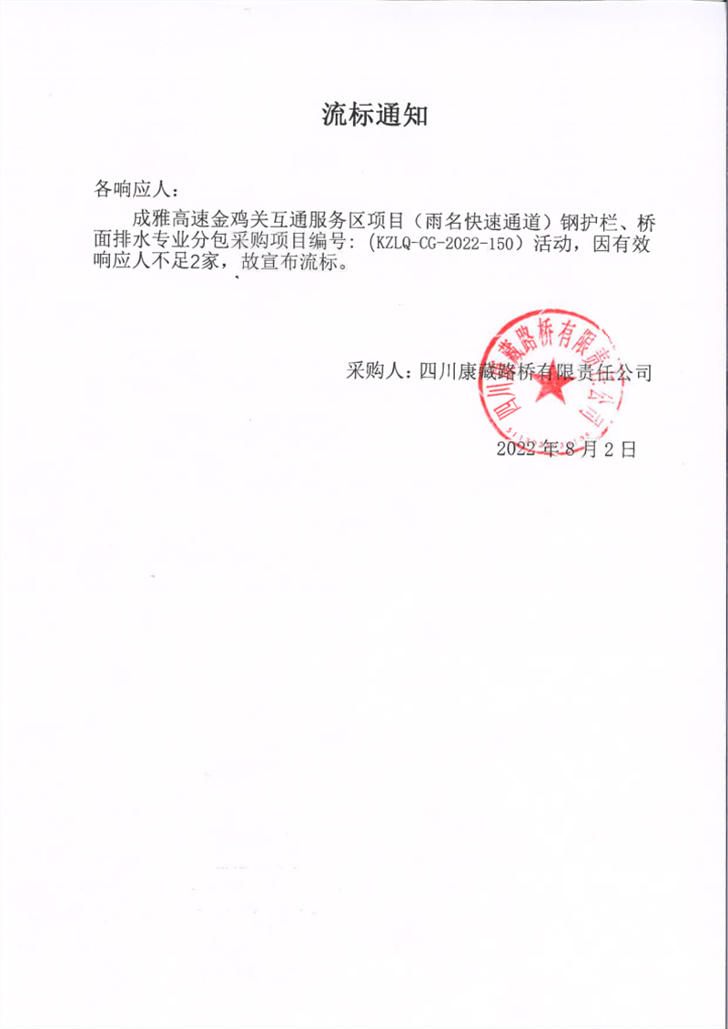 四川康藏路橋有限責任公司成雅高速金雞關(guān)互通服務區(qū)項目(雨名快速通道)鋼護欄、橋面排水專業(yè)分包采購項目流標通知