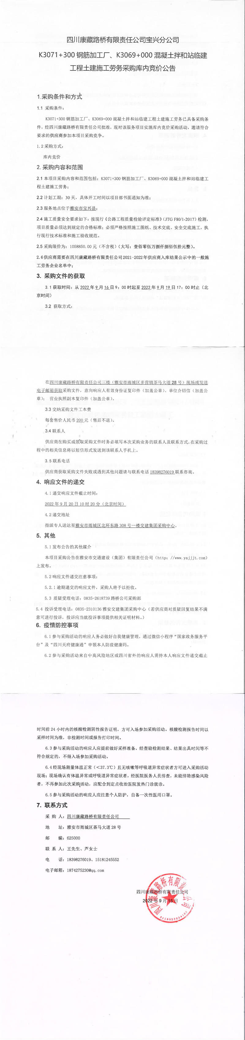 四川康藏路橋有限責(zé)任公司寶興分公司K3071+300鋼筋加工廠、K3069+000混凝土拌和站臨建工程土建施工勞務(wù)采購(gòu)庫(kù)內(nèi)競(jìng)價(jià)公告