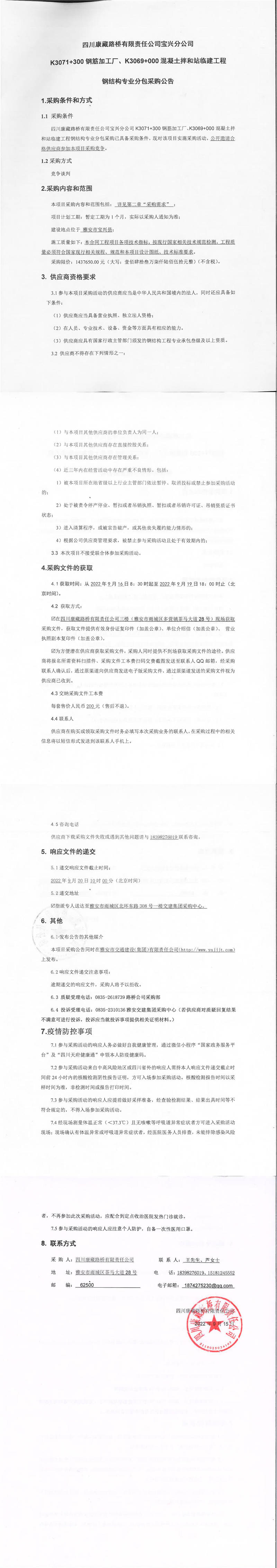 四川康藏路橋有限責(zé)任公司寶興分公司K3071+300鋼筋加工廠、K3069+000混凝土拌和站臨建工程鋼結(jié)構(gòu)專業(yè)分包采購公告
