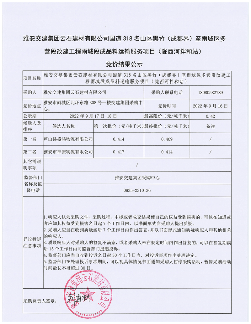 雅安交建集團云石建材有限公司國道318名山區(qū)黑竹(成都界)至雨城區(qū)多營段改建工程雨城段成品料運輸服務(wù)項目(皇茶大道拌和站)競價結(jié)果公示