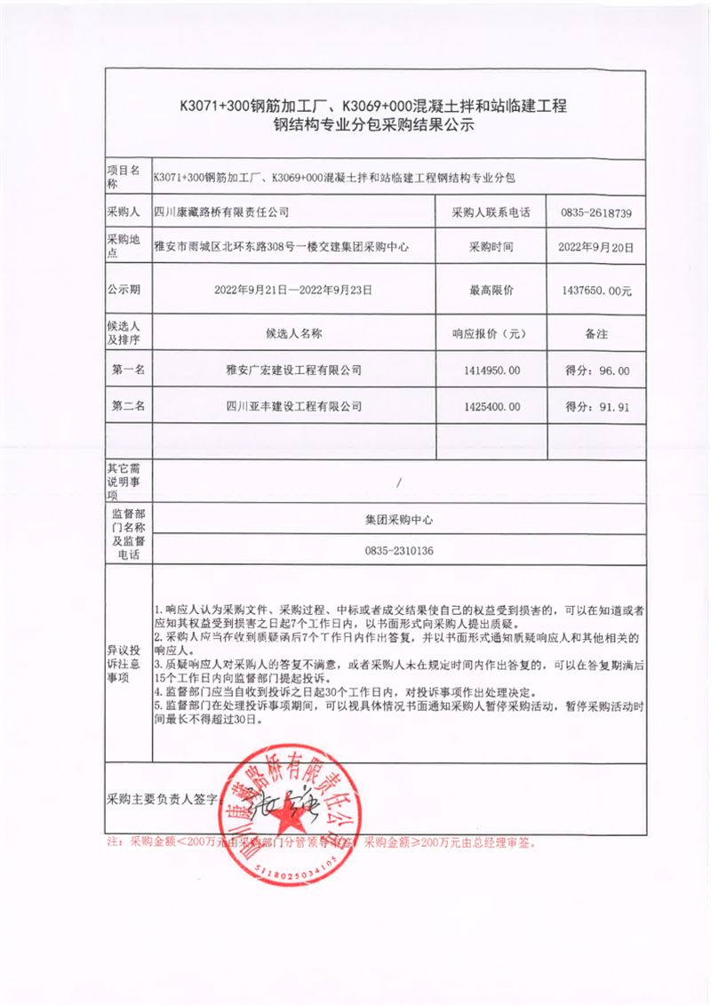 四川康藏路橋有限責任公司K3071+300鋼筋加工廠、K3069+000混凝土拌和站臨建工程鋼結構專業(yè)分包采購結果公示
