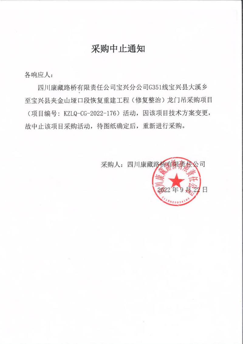 四川康藏路橋有限責任公司寶興分公司G351線寶興縣大溪鄉(xiāng)至寶興縣夾金山埡口段恢復(fù)重建工程(修復(fù)整治)龍門吊采購中止通知