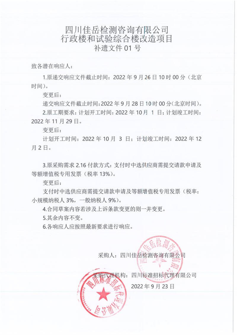 四川佳岳檢測(cè)咨詢有限公司行政樓和試驗(yàn)綜合樓改造項(xiàng)目補(bǔ)遺文件01號(hào)