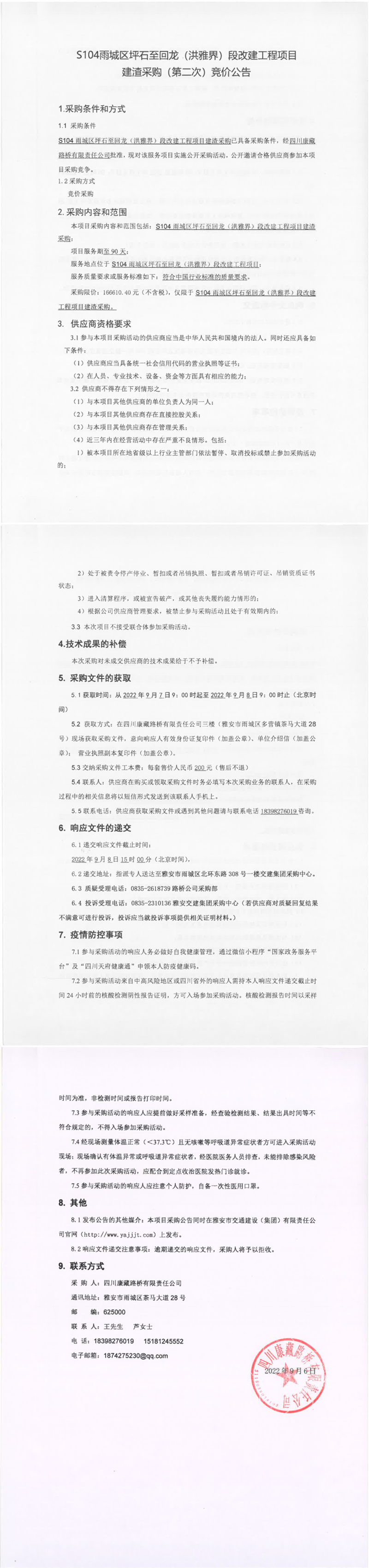 四川康藏路橋有限責(zé)任公司S104雨城區(qū)坪石至回龍(洪雅界)段改建工程項(xiàng)目建渣采購(第二次)競(jìng)價(jià)公告