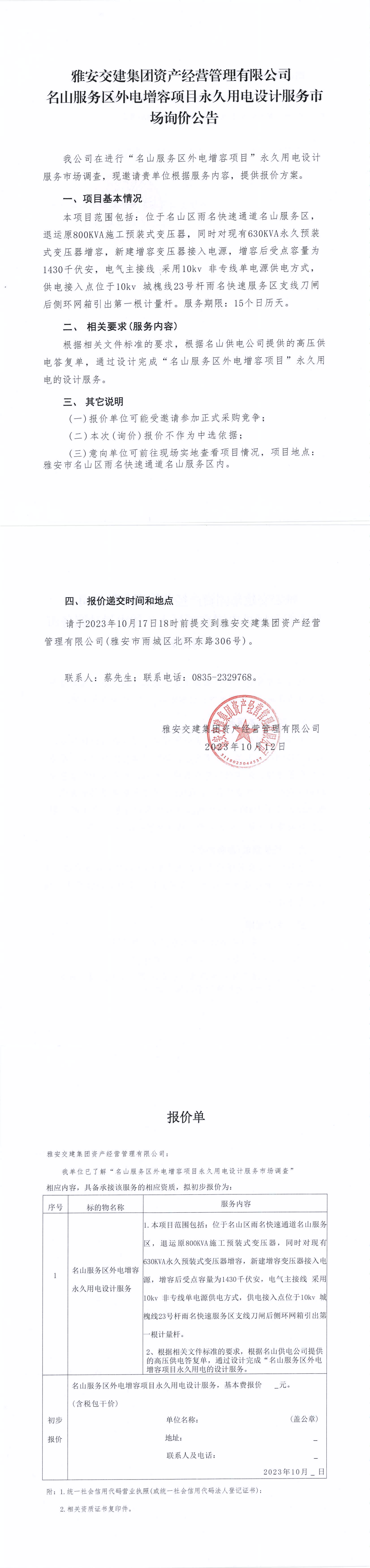 雅安交建集團(tuán)資產(chǎn)經(jīng)營管理有限公司名山服務(wù)區(qū)外電增容項(xiàng)目永久用電設(shè)計服務(wù)市場詢價公告