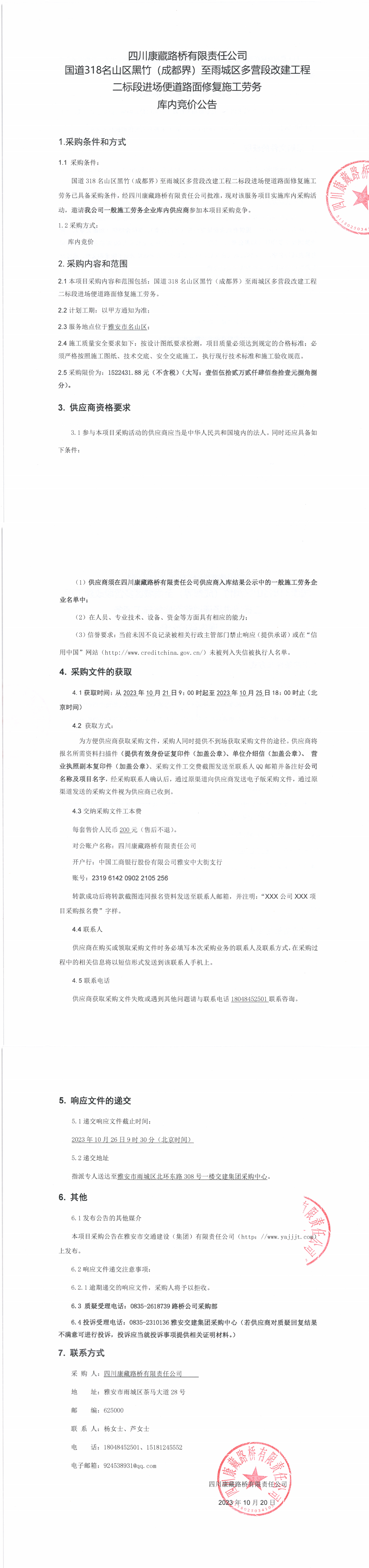四川康藏路橋有限責(zé)任公司國道318名山區(qū)黑竹(成都界)至雨城區(qū)多營段改建工程二標(biāo)段進(jìn)場(chǎng)便道路面修復(fù)施工勞務(wù)庫內(nèi)競價(jià)公告