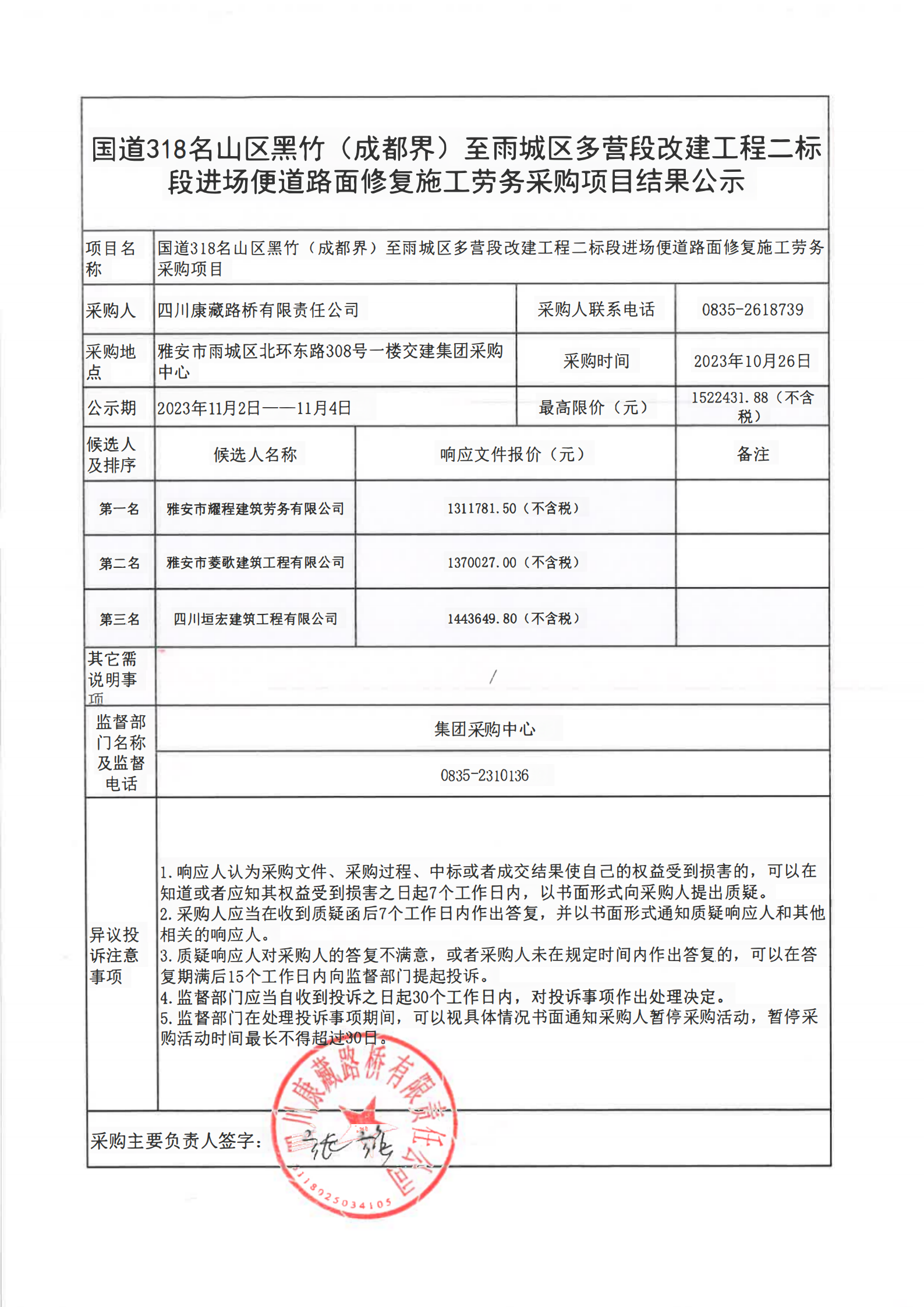 四川康藏路橋有限責任公司國道318名山區(qū)黑竹(成都界)至雨城區(qū)多營段改建工程二標段進場便道路面修復施工勞務采購項目結(jié)果公示