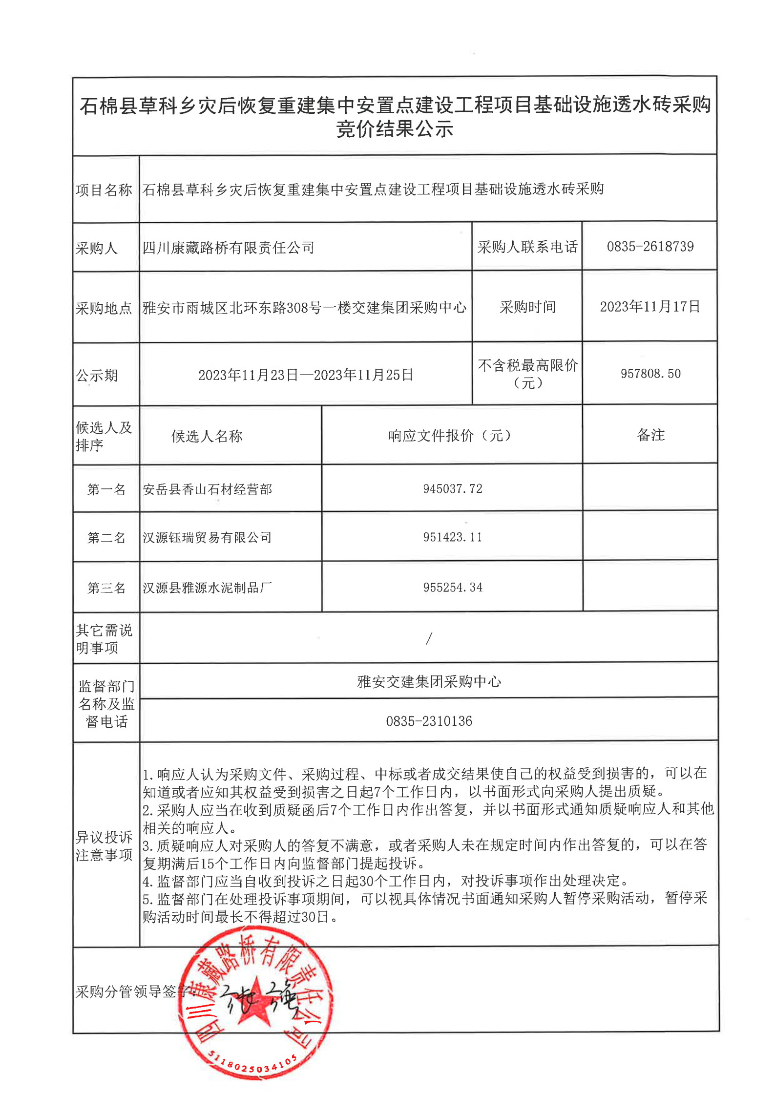 四川康藏路橋有限責(zé)任公司石棉縣草科鄉(xiāng)集中安置點(diǎn)重建工程項(xiàng)目透水磚采購結(jié)果公示