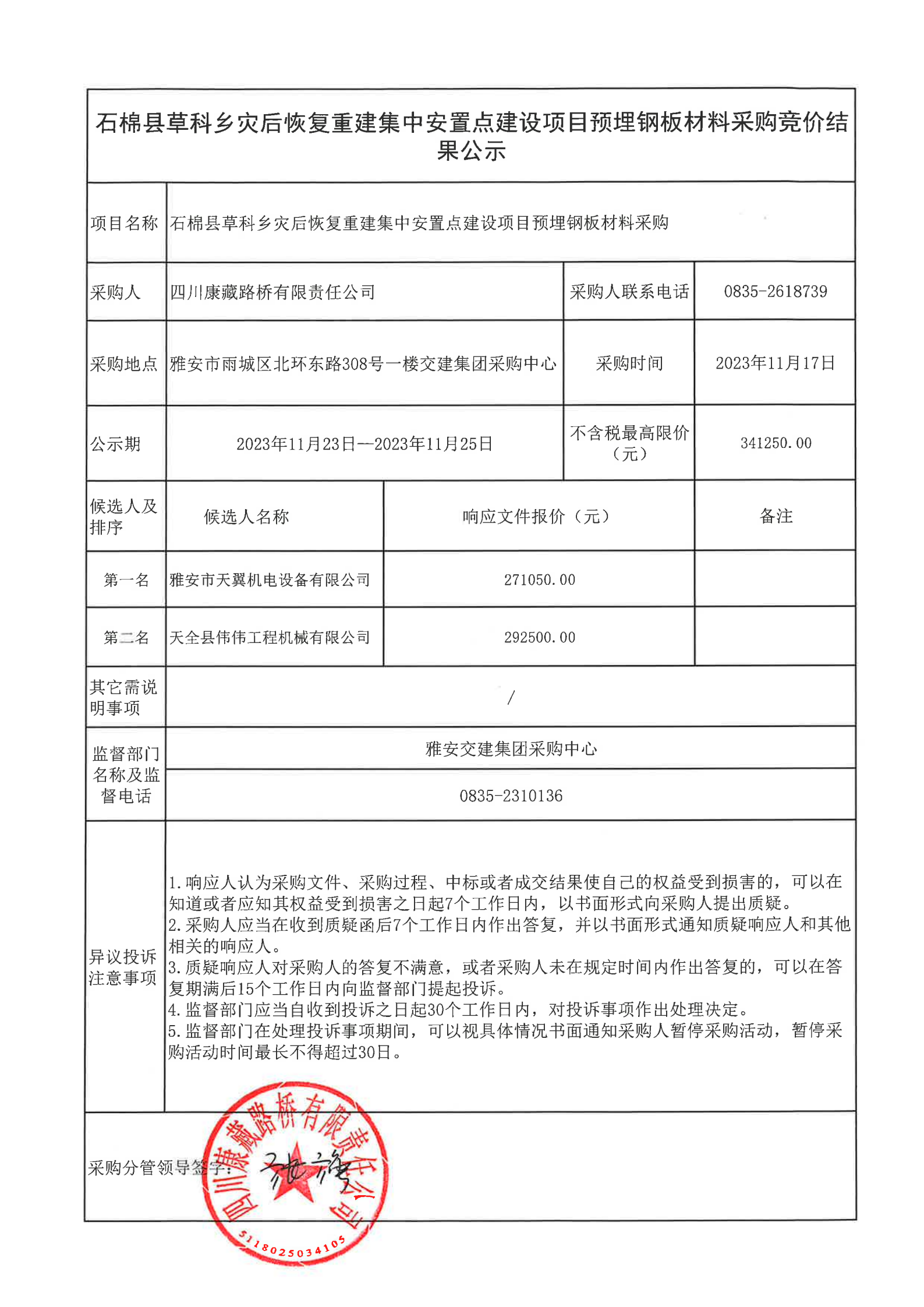 四川康藏路橋有限責任公司石棉縣草科鄉(xiāng)災后恢復重建集中安置點建設項目預埋鋼板材料采購結果公示