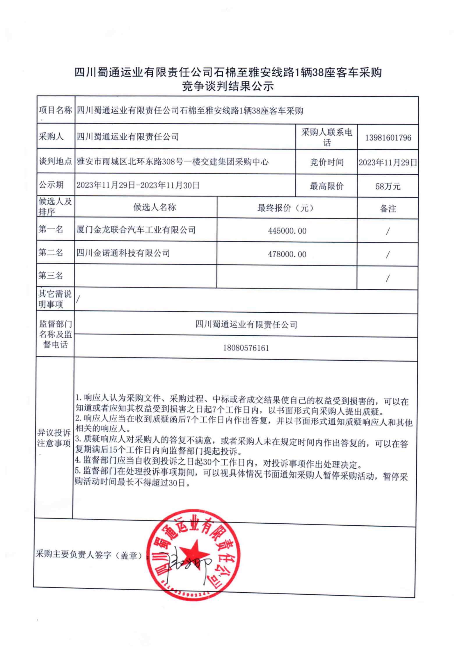 四川蜀通運(yùn)業(yè)有限責(zé)任公司石棉至雅安線路1輛38座客車(chē)采購(gòu)競(jìng)爭(zhēng)談判結(jié)果公示