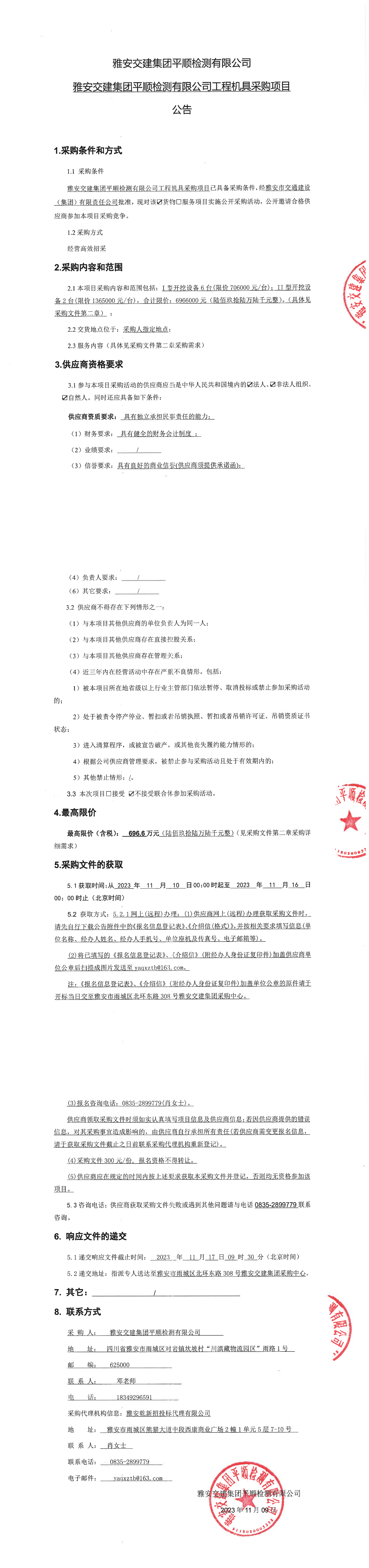 雅安交建集團平順檢測有限公司工程機具采購項目公告